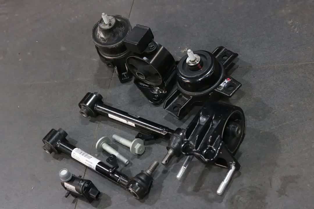 当时拆卸底盘时,又发现了一些小问题,发动机及变速箱支架及后拉臂都不行了,上面的胶套都是开裂老化的状态。