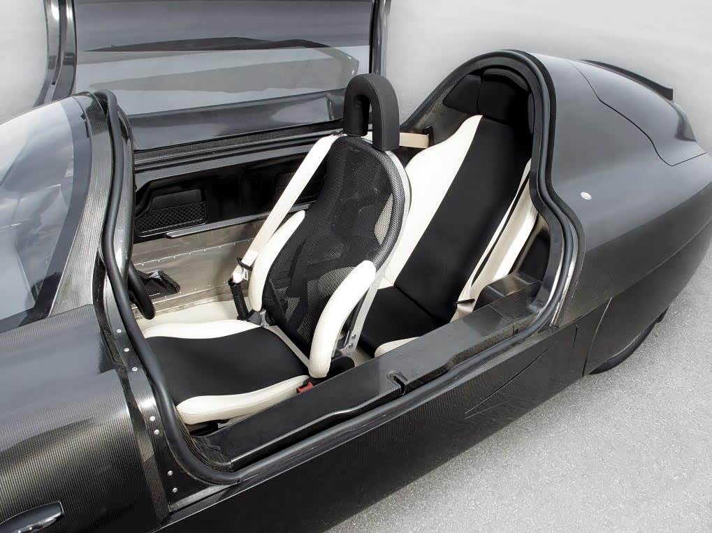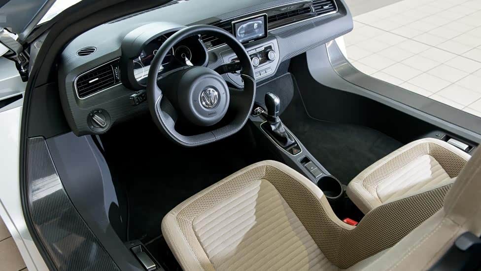 第三为了减少正面迎风面积,大众另辟蹊径,采用了串联座椅,而不是并排,也就是和摩托车一样,驾驶者在前,乘客在后,只能坐2人,以此减小挡风玻璃的面积,同时取消了后视镜,采用摄像头和车内电子显示器观察后方。