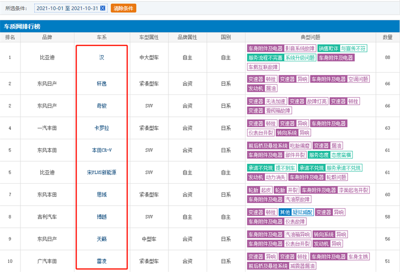 此外,前十榜单里日产轩逸、奇骏、天籁分列二三九位;丰田卡罗拉、雷凌则位列第四和第十;本田家族里,东本的CR-V和思域“收获”第五、第七的位置。在消费者口中一向皮实可靠的日系车,却在10月投诉排行榜前十的位置里,独占了七位,令人唏嘘。