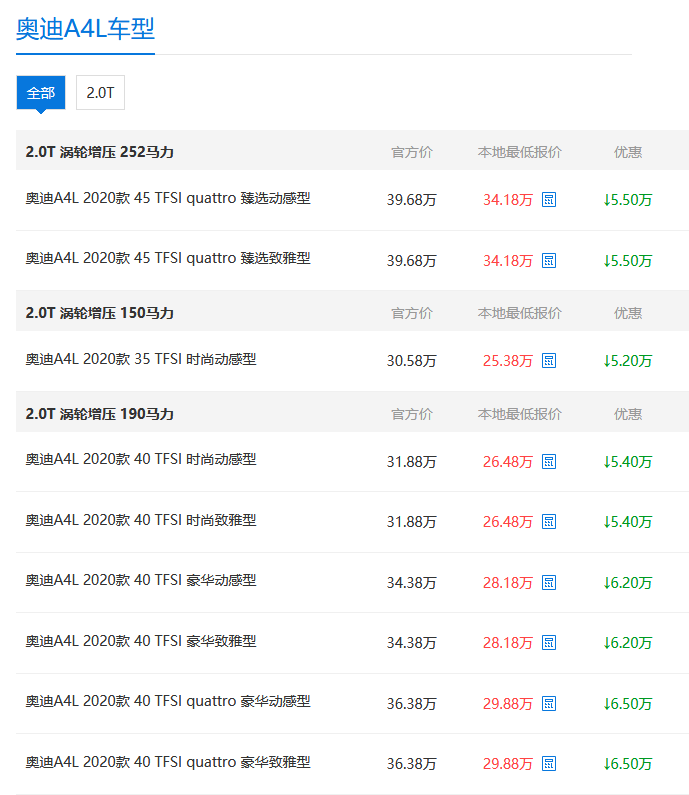 广州地区某汽车经销商近日公布了奥迪A4L在该地区的优惠行情:目前奥迪A4L购车最高优惠6.5万元,25.38万元起售,具体售价信息如下图所示: