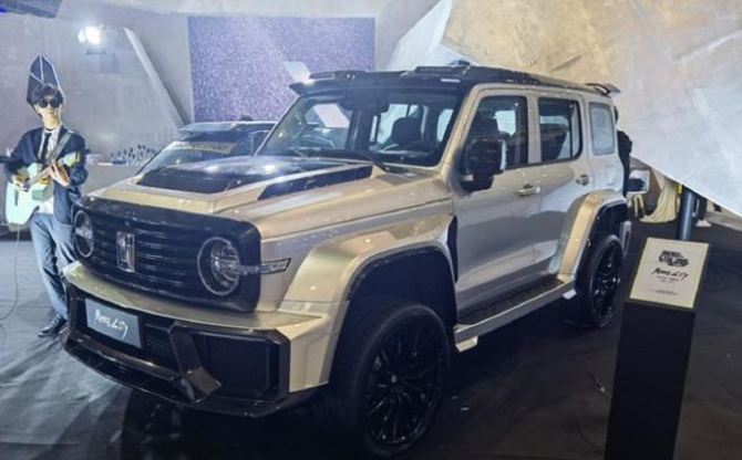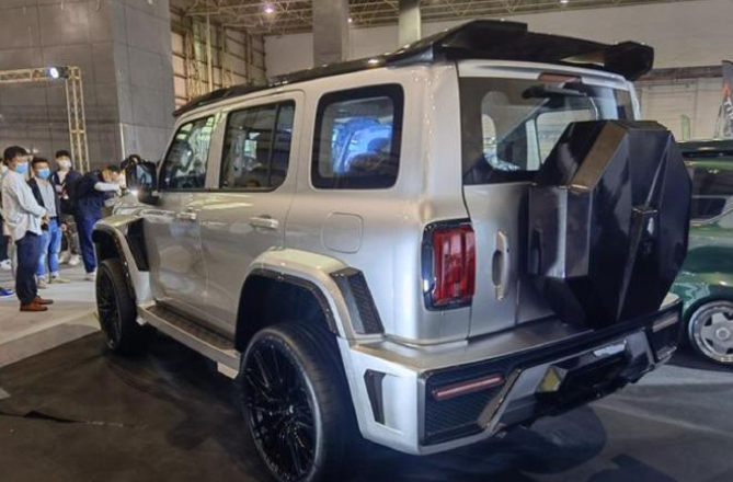 新车的机盖中央高高隆起,两侧有着熏黑的散热口,中央则是大面积熏黑饰板包裹着的玻璃引擎盖,内部为X型的宽厚支撑结构,看起来有种“性能”车型的视觉效果,并且下方整个保险杠整体换装为巴博斯套装,凸起并且棱角分明,在外侧还有着熏黑的烤漆饰板包裹,搭配上内部熏黑的网状格栅,十分个性。