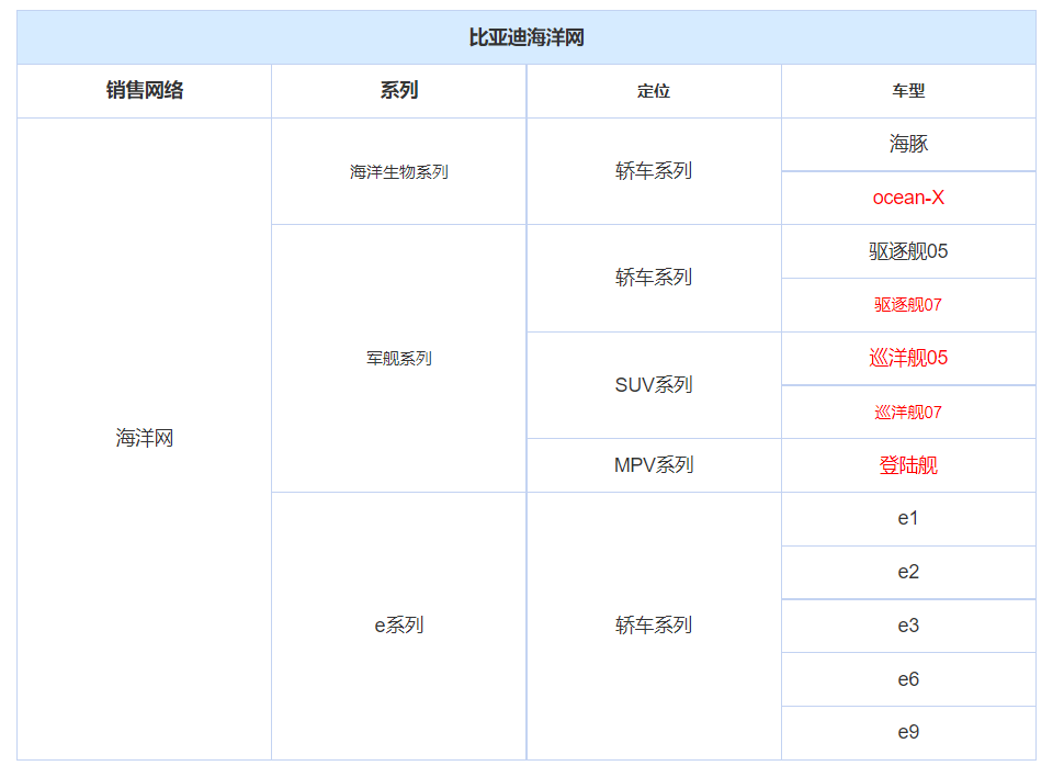 从最新的规划来看,未来比亚迪新车主要是分为海洋生物和军舰两大系列,其中以海洋生物命名的车型将会是纯电动车型。而军舰命名的车型将会搭载DM-i超级混动技术的动力系统,其中,轿车车型命名使用驱逐舰的名字加数字,SUV车型将会使用巡洋舰+数字的命名方式。