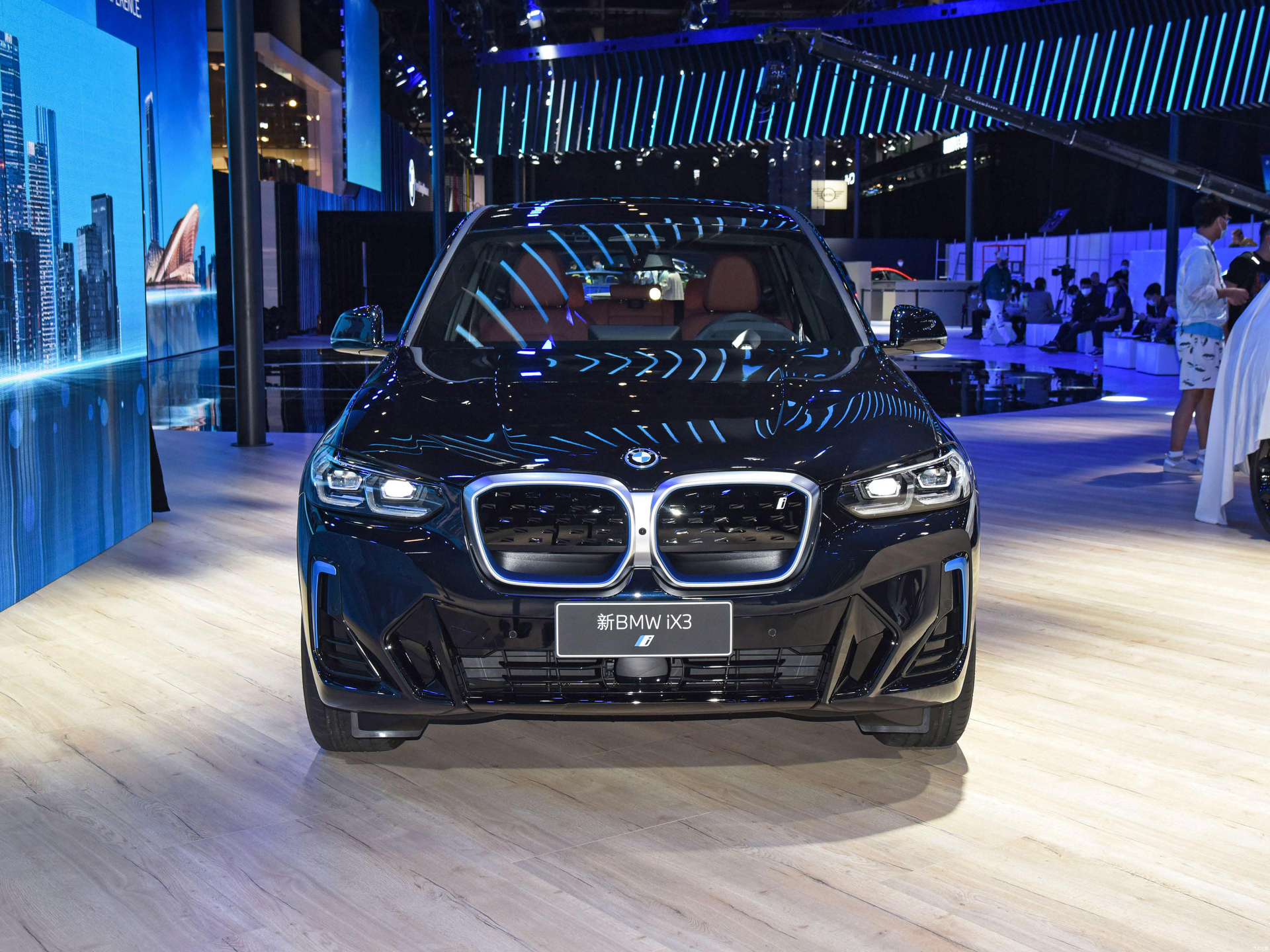 外观部分,宝马ix3前脸延续家族式设计风格,硕大的封闭式格栅采用了蓝色镀铬条修饰以及BMW的蓝天白云车标,有着很高的辨识度,还有减少风阻的作用。前大灯使用了全LED光源,照明效果很好,提升了夜晚行车安全性。车头下方采用多边形设计的进气槽,内部采用熏黑处理,营造出年轻运动的视觉效果。