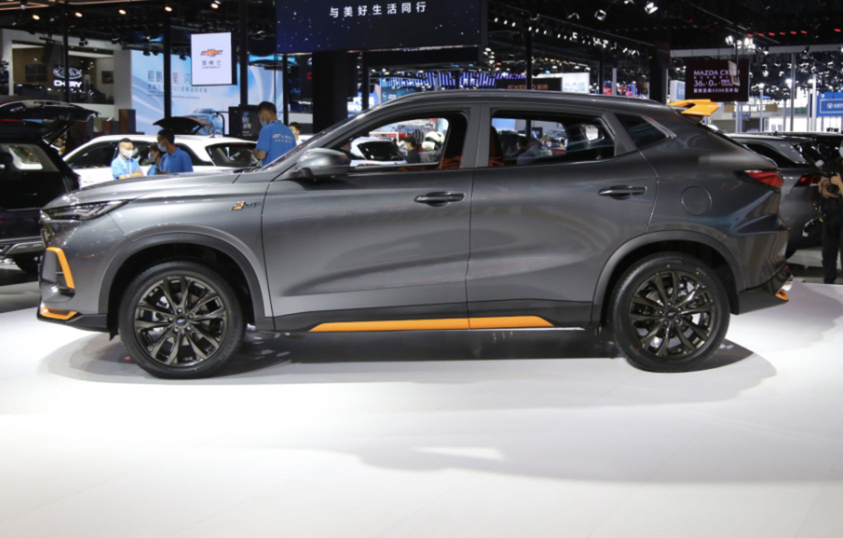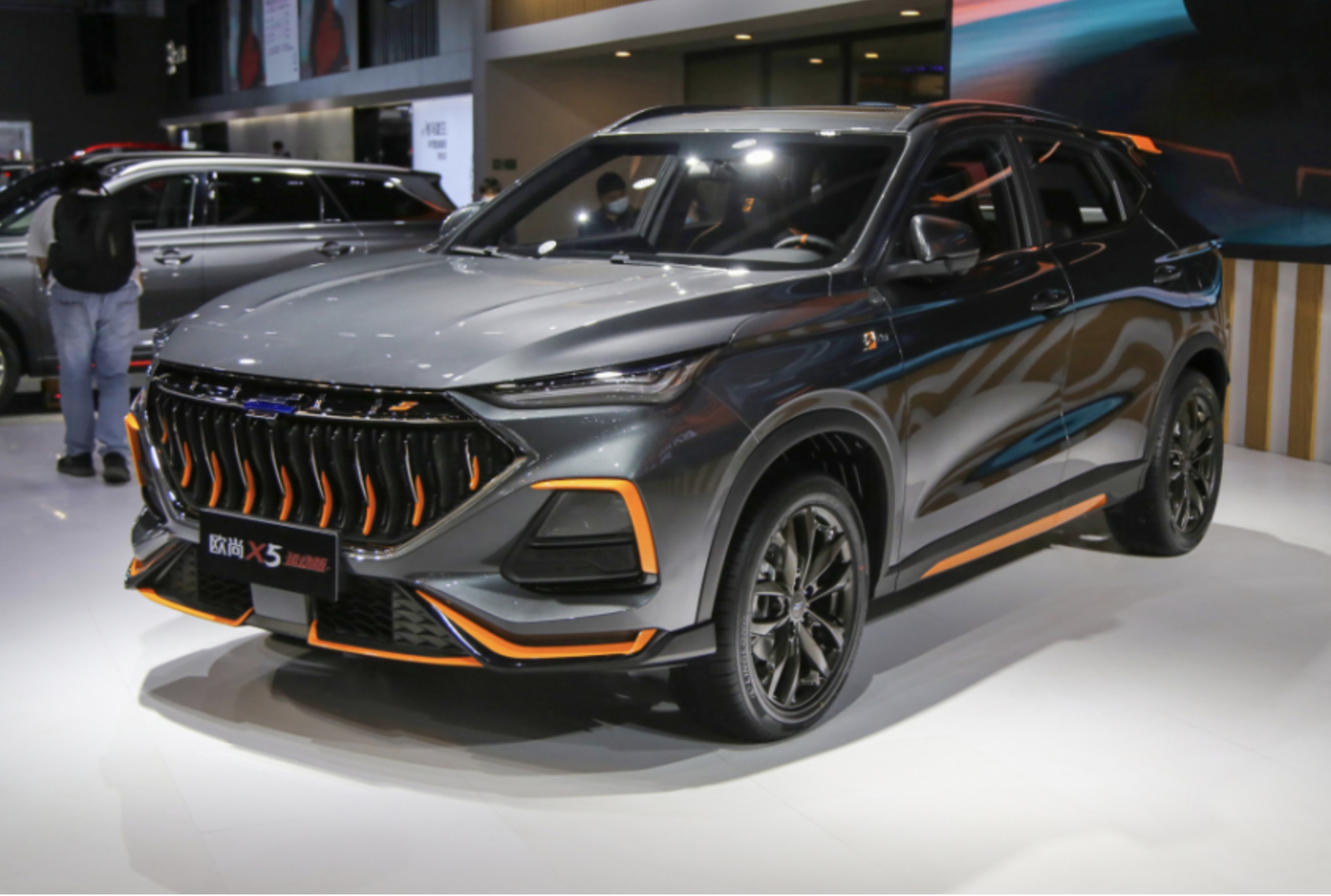 外观方面,新车将基于欧尚X5打造而成,采用硕大的鲨鱼嘴造型的前格栅搭配橙色元素饰条点缀,搭配两侧犀利且狭长的大灯组形成一体化的布局,两侧配备进气口,搭配造型非常运动的前包围设计,同样加入了橙色元素点缀,整个车头看上去运动感十足且非常的富有活力气息。