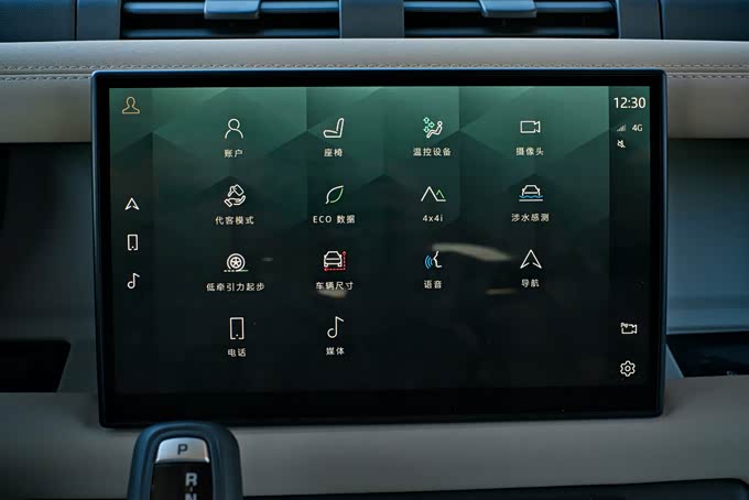 3、本次评测的这台路虎卫士90 P400 XS搭载了一块11.4英寸的中控液晶触摸屏幕,首先值得肯定的是屏幕的造型设计很独特,尤其是背部与中控台之间掏空的处理,不仅看上去很新颖,同时也增加了车内的储物空间。