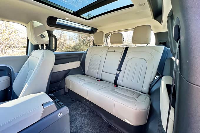 4、虽然路虎卫士90采用了短轴双门的造型,但后排乘坐空间并没有受到太多影响,座椅乘坐起来也足够舒适,腿部剩余空间能够达到两拳左右,反而是头部空间表现一般,没有想象中出色,不过有一点表现不错,就是后排中间地板几乎是纯平的,可以有效提升后排乘坐的舒适性。另外路虎卫士90的后排车窗非常宽大,再加上车顶两侧的天窗,后排的视觉非常通透,没有压抑的感觉。