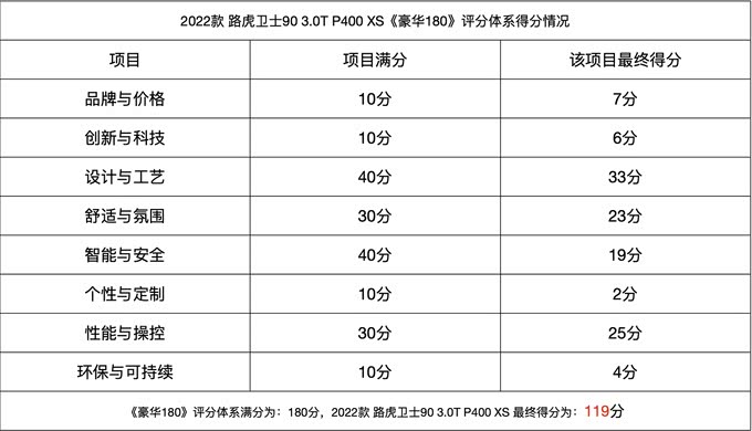 最后我们来看看这台2022款 路虎卫士90 3.0T P400 XS在“豪华180”豪华评分体系的总分是多少: