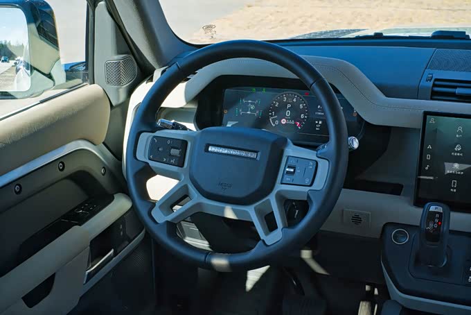 1、路虎卫士90的方向盘采用了真皮材质包裹,如同该车的定位一样手感偏硬,算不上细腻,不过样式却很有设计感,尤其是哑光银色的框架,手感甚至要比真皮更加出色,配合上镂空的处理看上去也很时尚,而两侧较大的多功能按键又透露出了粗旷的风格。方向盘的手感方面握感偏细,整体盘辐较大,属于典型的硬派越野车风格。路虎卫士90的换挡杆位于中控台左侧,采用了电子挡杆的设计,排档杆的造型比较普通,整体没有什么特别的亮点。