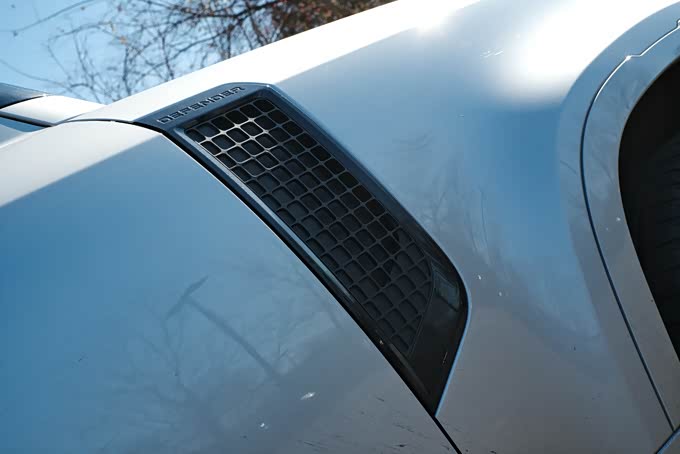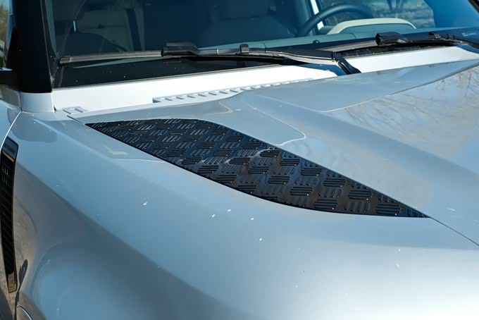 3、路虎卫士90在车漆颜色的选择方面非常丰富,提供了多达13种不同风格的涂装,其中还包括了哑光磨砂质感的车漆,本次评测的这台卫士90采用了名为长野雪山银的涂装,配合上车身多处黑色的细节装饰营造了很酷的感觉,并且车漆的质感也非常出色。