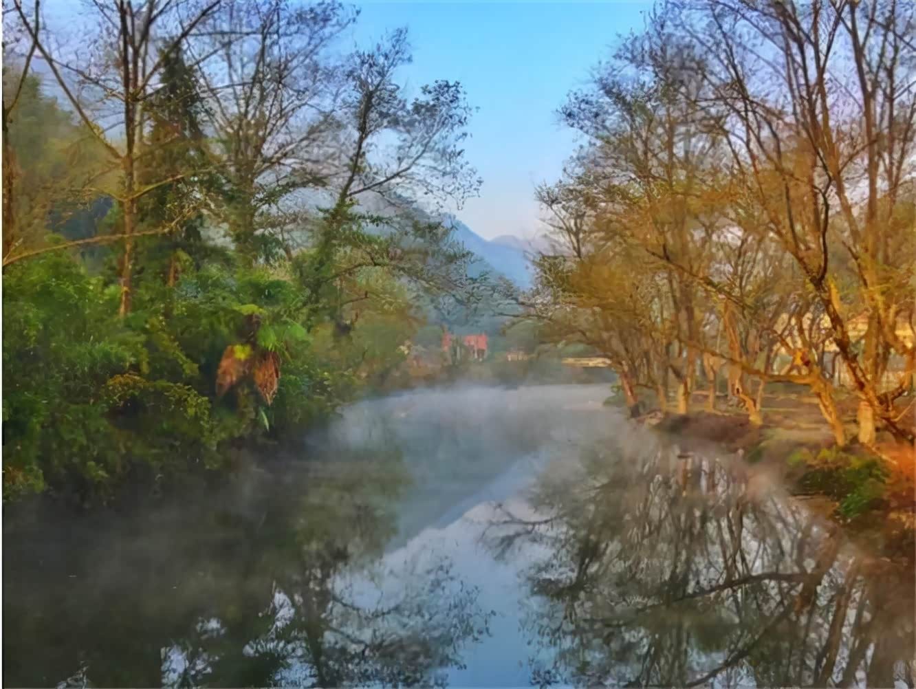 清晨,早晨山水笼罩在烟雾缭绕之中,仿佛到了神仙境地。水面会有平流雾特色景观,是摄影者绝佳摄影创作基地。