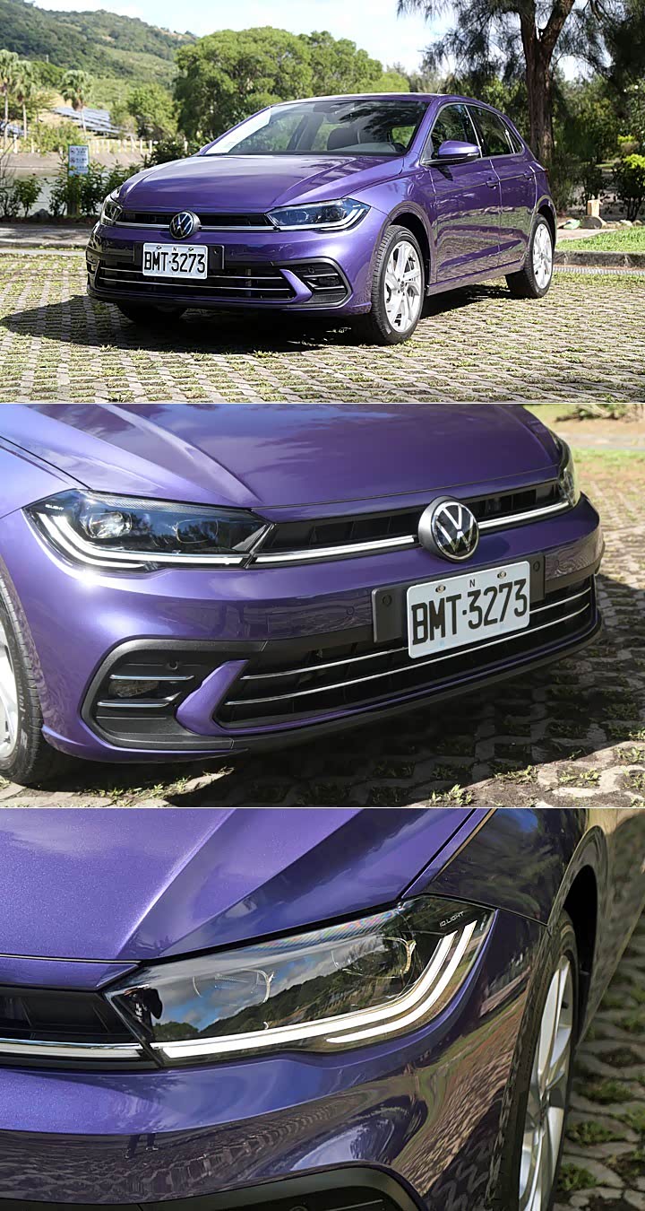 小改款 Polo 自外貌上最明显可见的,乃是头灯组的重新排列。本次试驾的 230 TSI Style 车型标配 IQ. Light 灯光科技与 Matrix LED 矩阵式头灯,左右灯组的昼行灯延伸出贯穿水箱护罩新世代家族设计的 LED 定位灯,成为小改款 Polo 视觉上抢眼的特色。前保杆则重新打造出双镀铬横幅的设计,亦是大众新世代车款的特色之一。