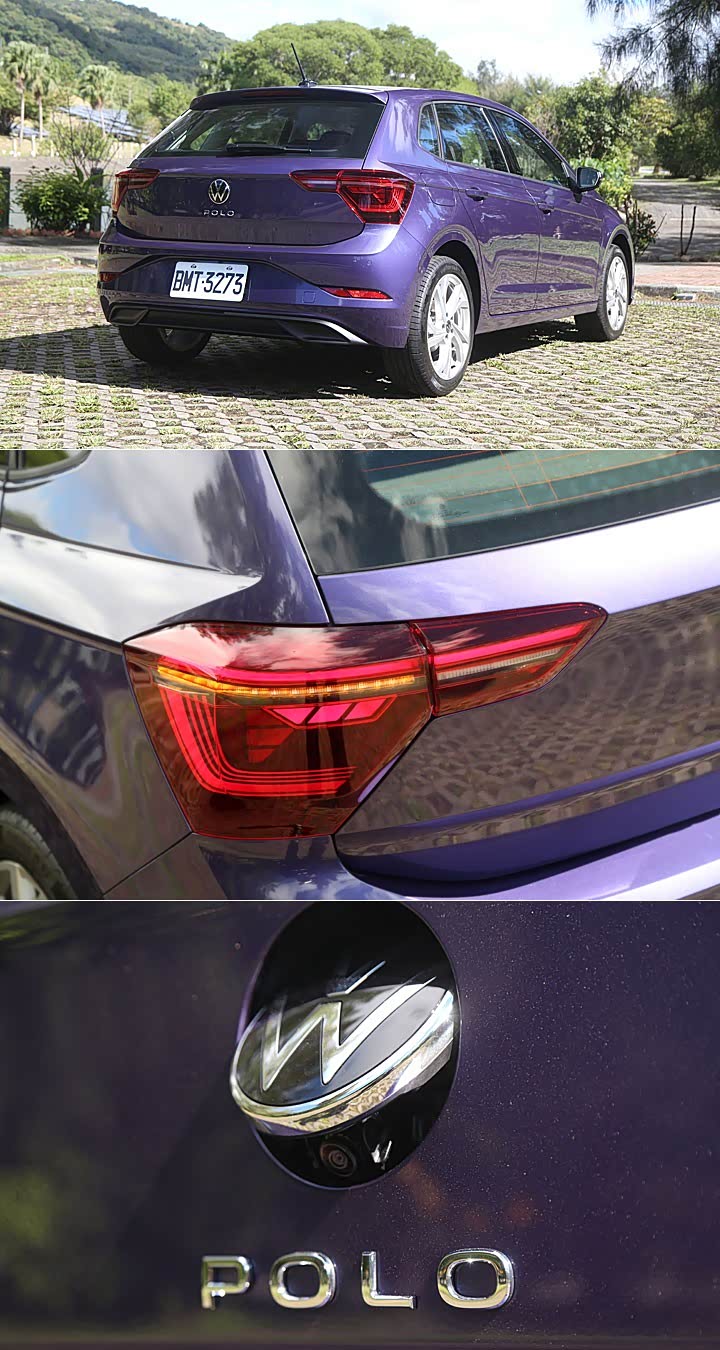车侧的部分线条基本上与改款前相同,不过 230 TSI Style 标配的 17 吋 Tortosa 为小改款车型带来更动感轻颖的视觉感。原先造型较方正的六角形尾灯,透过向中间延伸成了全新倒 L 造型的分离式设计,同时 IQ.Light 也带来新的动态转向指示灯,Polo 铭牌亦放大并且改至中央厂徽之下,同样呈现品牌新世代车款的样貌。