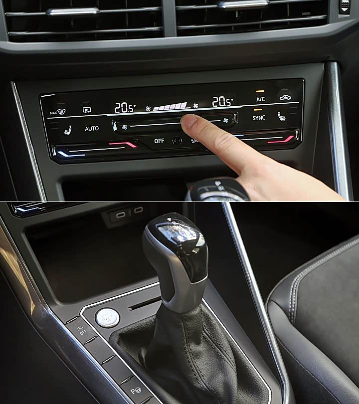 视线来到中控台下方。排档杆也同步换上大众新世代车型共享的造型设计。而在中高阶车型上空调面板也改为触控式操作。其舍弃了传统旋钮与按键,触控时虽然不会有反馈力,但是透过表面的凹凸设计区分不同区块,上手后并不难操作。