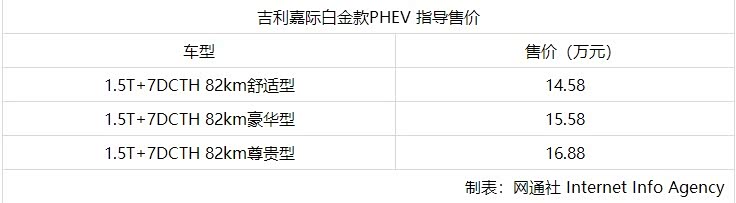 最大续航1100km 吉利嘉际白金款PHEV售14.58万起